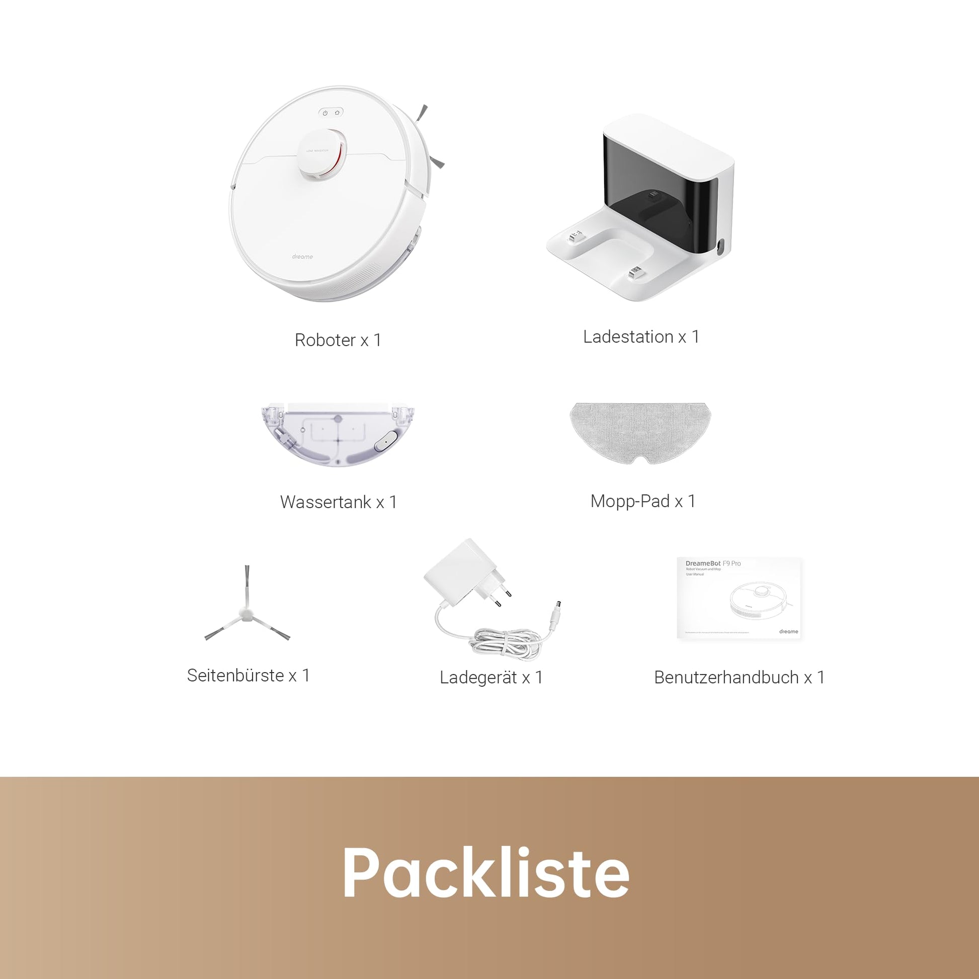 Einzelheiten: Dank der präzisen LiDAR-Navigation erstellt der DreameBot F9 Pro schnell eine Karte und plant den effizientesten Reinigungspfad, um Ihr Zuhause wie ein Experte zu reinigen. Er gewährleistet eine präzise Hindernisvermeidung, um ein Feststecken, selbst in mehreren verwickelten Drähten und Kabeln auf dem Boden, zu verhindern. Dank eines bürstenlosen Nidec-Motors und einem schlanken Luftkanaldesign bietet der F9 Pro eine starke Saugkraft von 2500Pa, um Tierhaare und Schmutz schnell zu bewältigen. Wählen Sie den am besten geeigneten Modus aus vier einstellbaren Saugstufen (Leise, Standard, Stark und Turbo) basierend auf dem Verschmutzungsgrad von Hartböden oder Teppichen mit niedrigem Flor. Der F9 Pro ist eine leistungsstarke Kombination aus Staubsaugen und Wischen 2-in-1. Stellen Sie den Kehr-, Wisch- oder den gleichzeitigen Kehr- und Wischmodus in der Dreamehome-App ein. Eine beeindruckende Kombination aus einem großen Wischpad und einer verlängerten Hauptbürste von 16,8 cm ermöglicht es dem F9 Pro, Schmutz und hartnäckige Flecken auf Hartböden und Teppichen mühelos zu bekämpfen