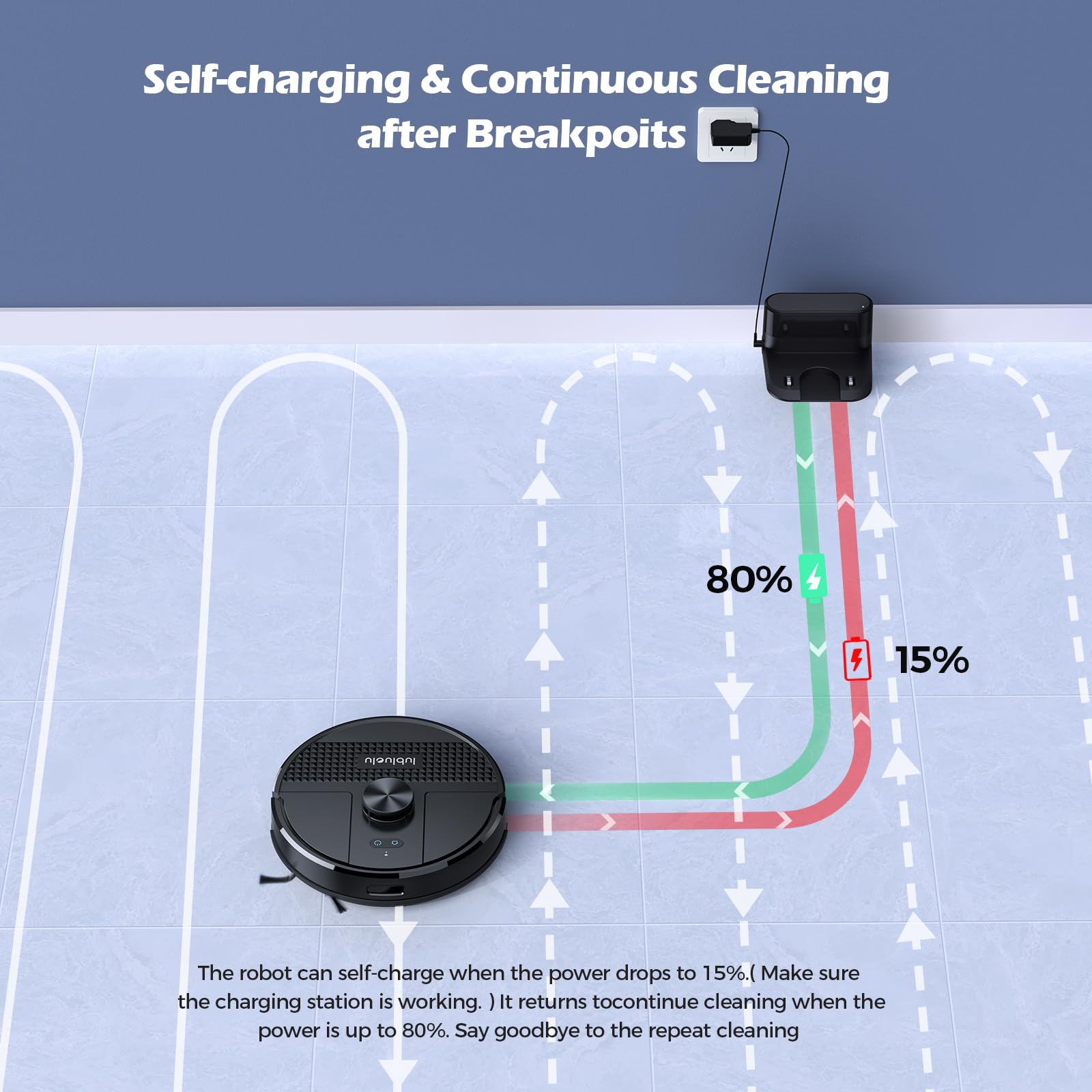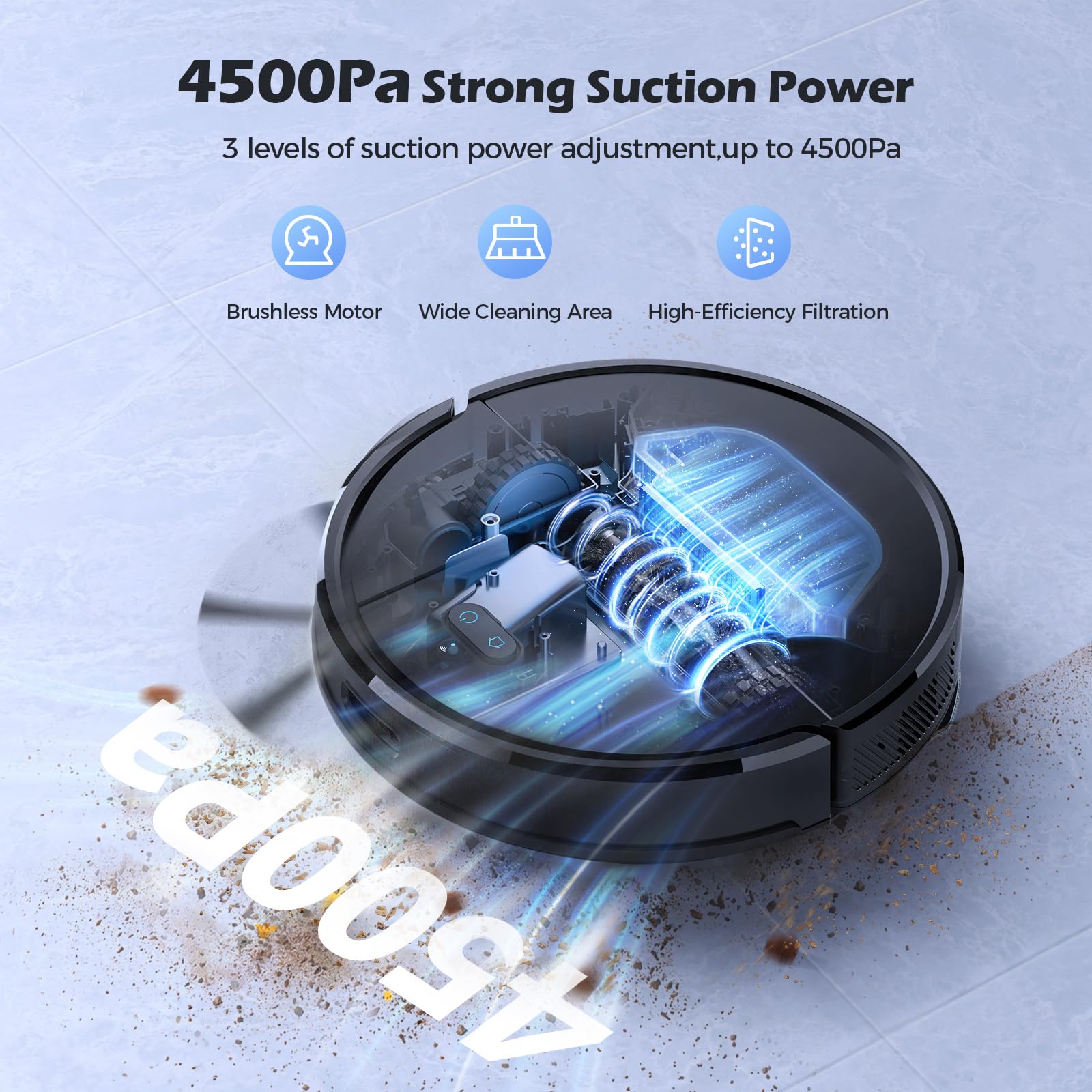 - 【4500Pa Starke Saugleistung,90-150Min Laufzeit】Mit dem japanischen Hochgeschwindigkeits-BIDC-Motor hat der Staubsaugroboter eine Saugleistung von bis zu 4500Pa* mit 3 Stufen der Einstellung. Akkulaufzeit von bis zu 150* Minuten bei minimaler Saugleistung. Egal, ob es sich um einen Holzboden, einen Keramikboden oder einen Teppich handelt, die Seitenbürste und die Rollbürste können doppelte Arbeit leisten, um Staub, Schmutz und Haare aus allen Ecken Ihres Hauses zu entfernen. *Basierend auf Lubluelu Labs, die tatsächliche Leistung kann in anderen Umgebungen abweichen.
